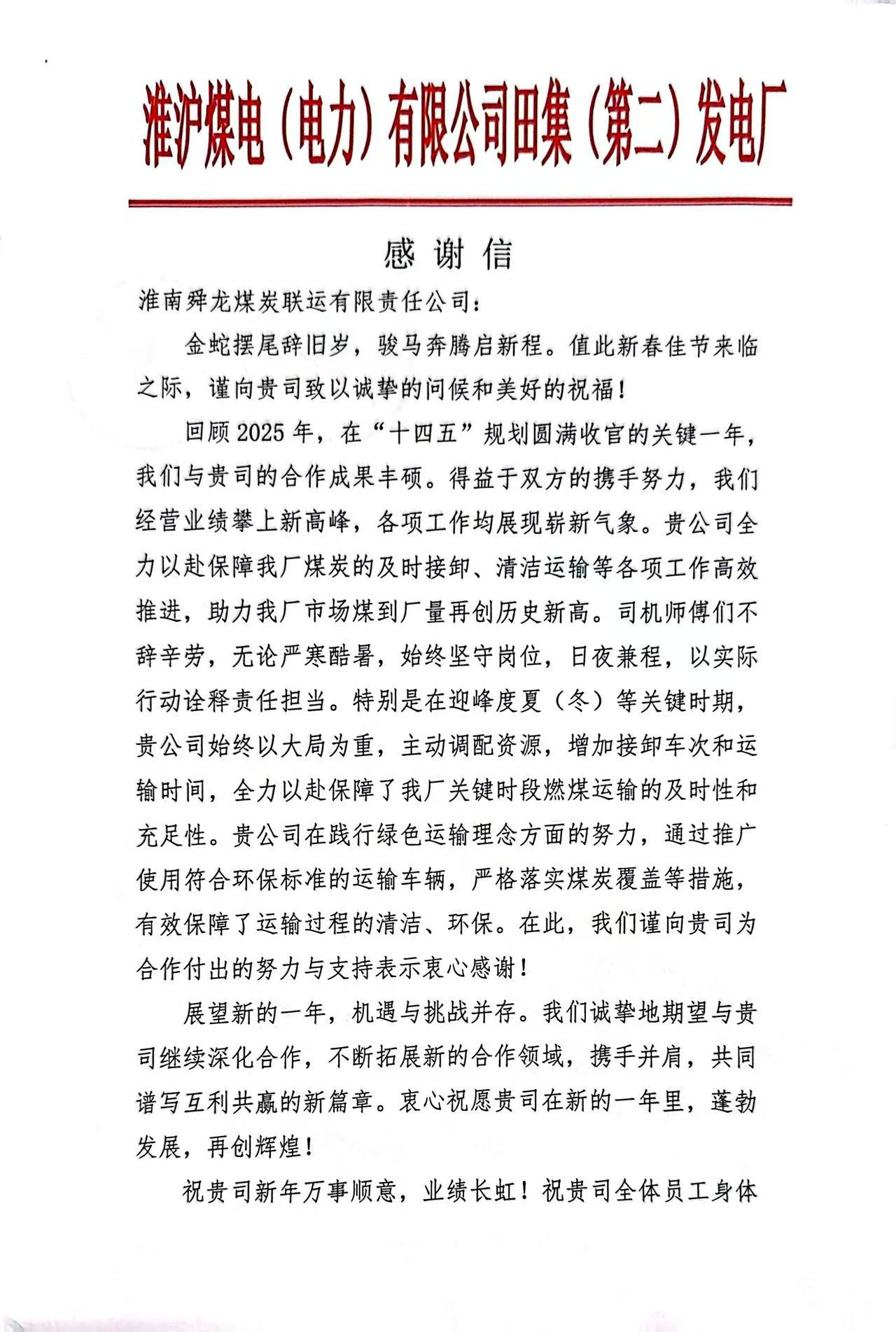 新年伊始,淮沪煤电(电力)有限公司田集(第二)发电厂发来感谢信,对淮南舜龙煤炭联运有限责任公司2025年的辛勤付出和支持帮助表示感谢。