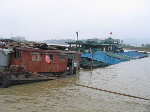 经全队人员奋力抢救,驳船被拖入浅滩,图为沉船现场。
