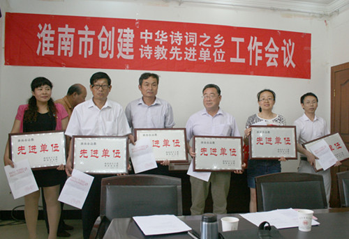 6月11日上午,淮南市创建中华诗词之乡、诗教先进单位工作会议在凤台县总工会四楼会议召开,会议由淮南煤矿诗词学会副会长青和平主持。舜龙公司作为安徽省中华诗教先进单位、淮南市诗教先进单位受到大会表彰。会上,淮南市硖石诗词学会会长周文龙作了工作讲话;市文联党组书记、主席杨天超宣读了市关工委、市文联关于表彰淮南市诗教先进单位的决定,并向获奖单位颁发了奖牌; 淮南市硖石诗词学会会长周文龙代表安徽省诗词学会宣读了关于表彰安徽省中华诗教先进单位的决定,并向获奖单位颁发了奖牌;市关工委常务副主任杨映松作了总结讲话。