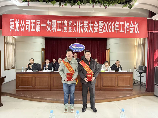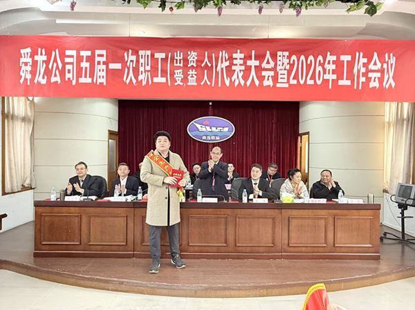 2月14日上午,舜龙公司五届一次职工(出资人、受益人)、工会会员代表大会暨2026年度工作会议在二楼会议室隆重召开。